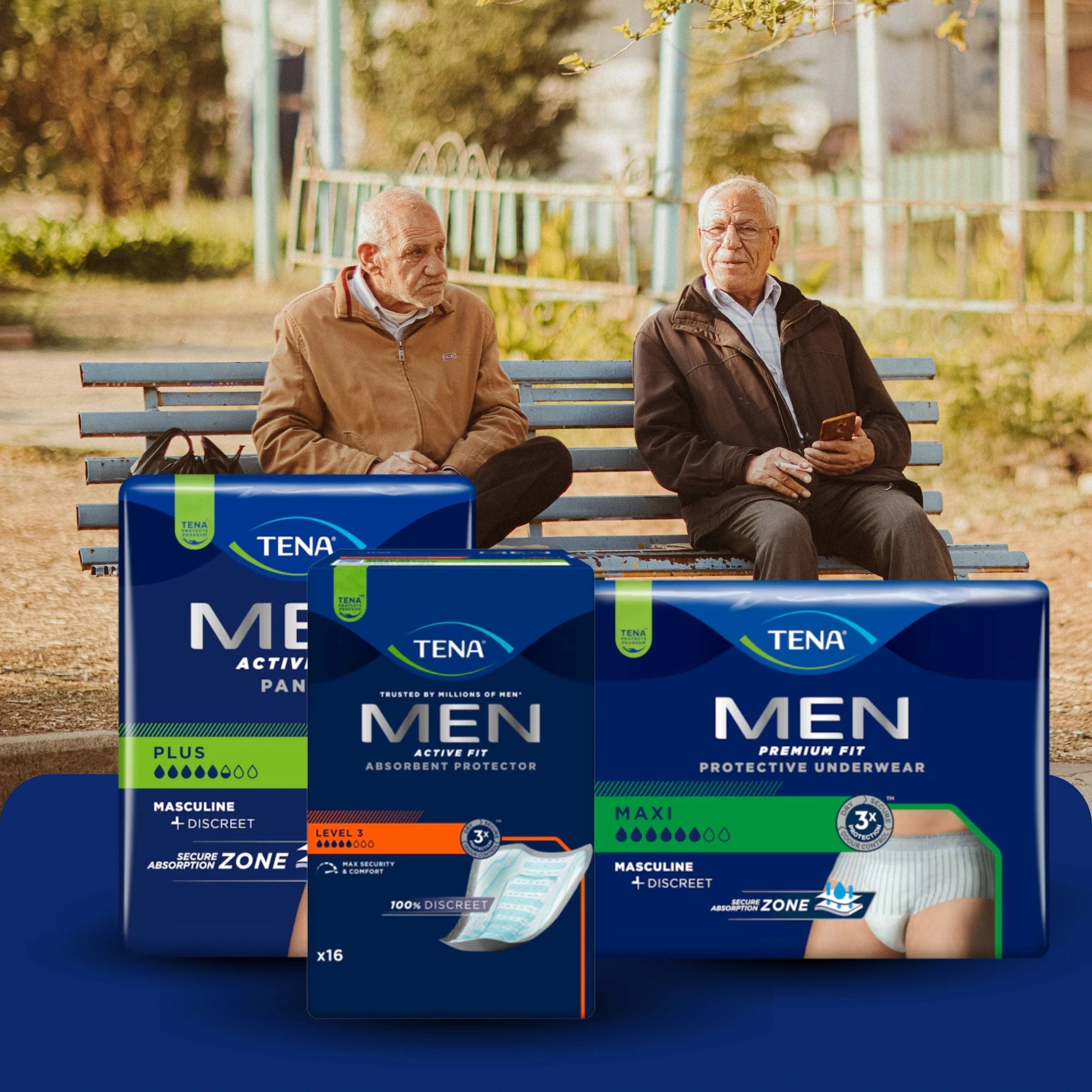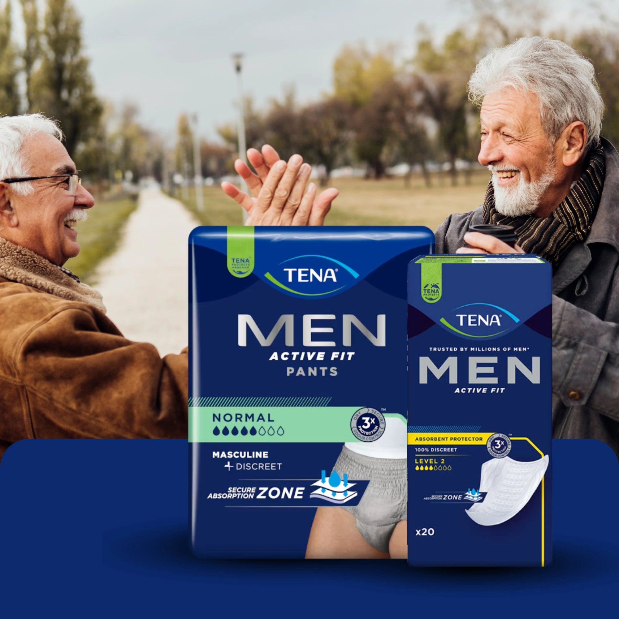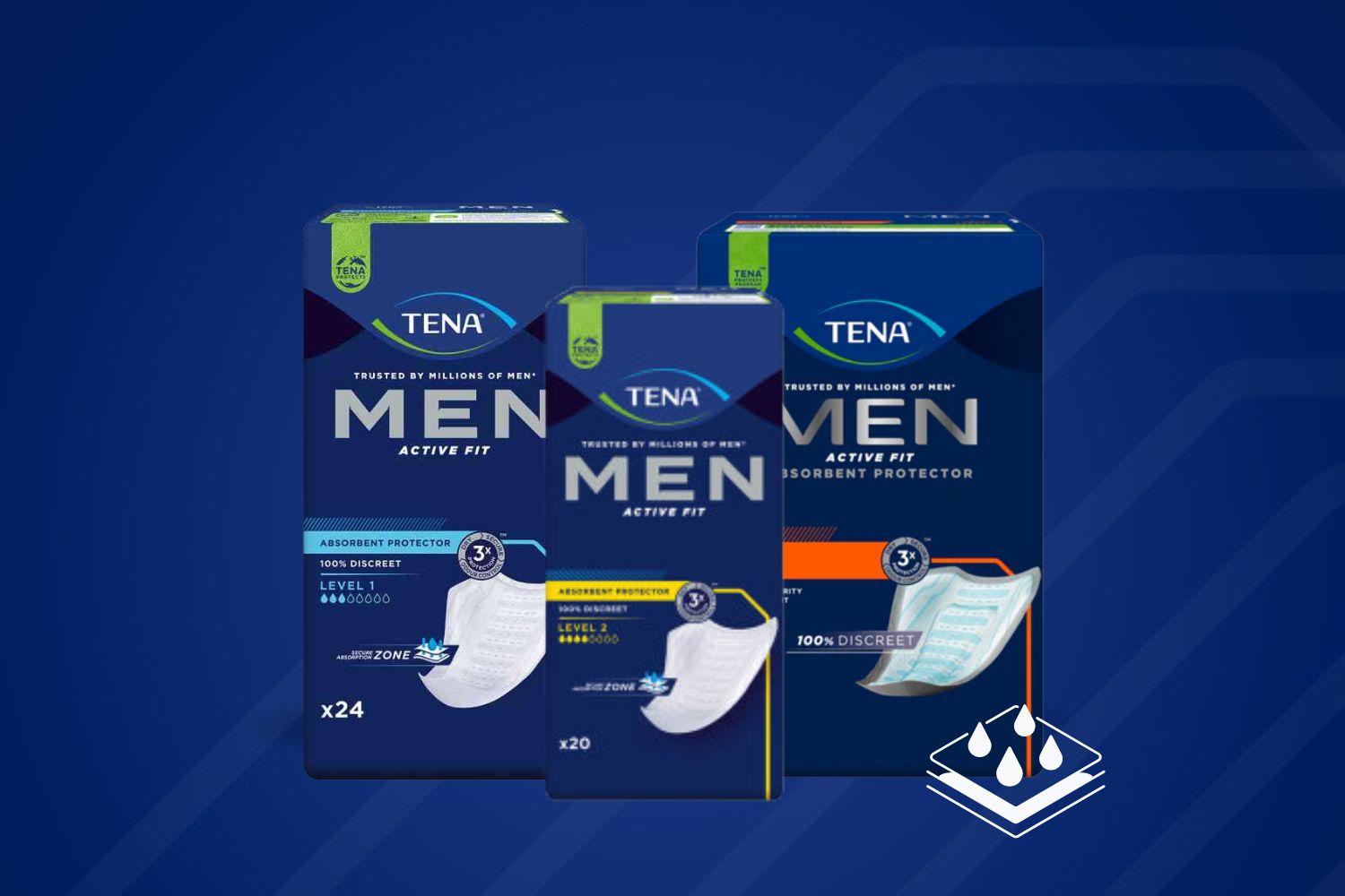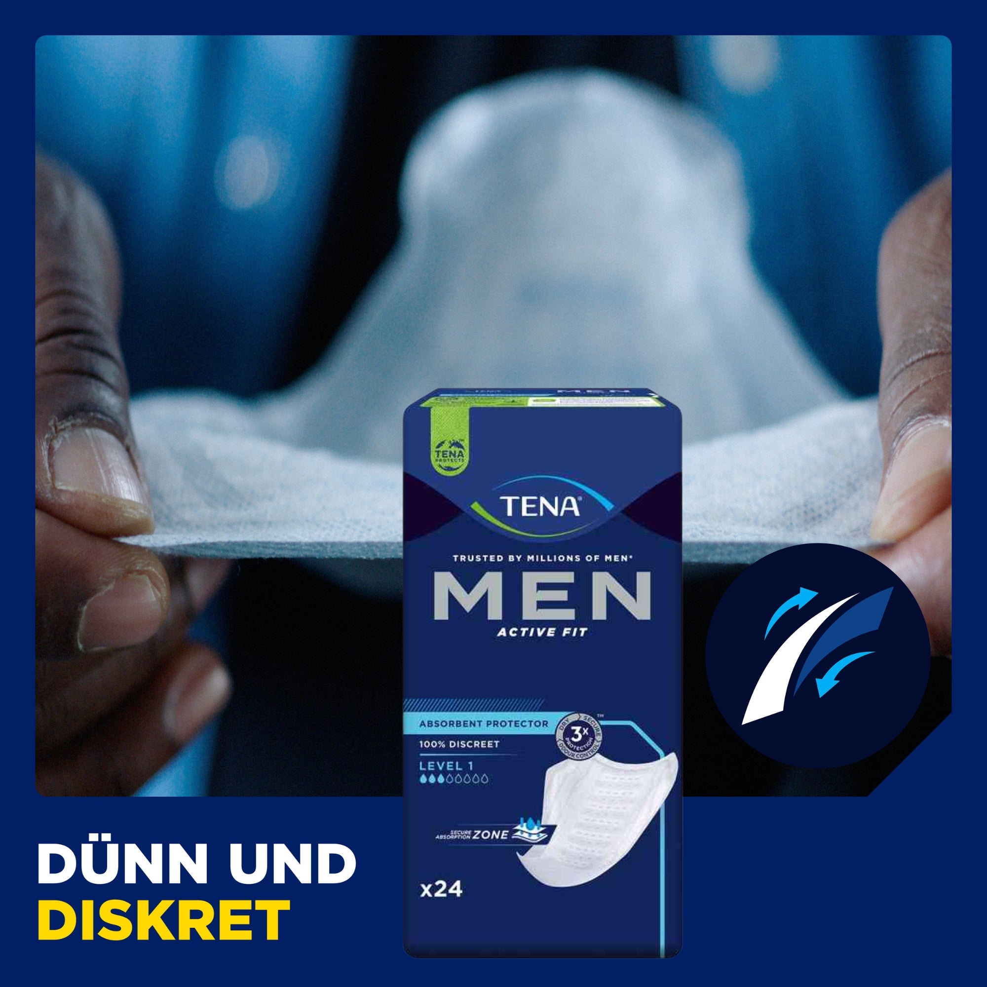 TENA Men pads were specially developed for the male anatomy and provide reliable incontinence protection in everyday life. The anatomically shaped pads adapt optimally, fit securely, and ensure a comfortable wearing experience. Thanks to their discreet shape, TENA Men pads are hardly visible under clothing and are ideal for active men who value comfort, security, and discretion.