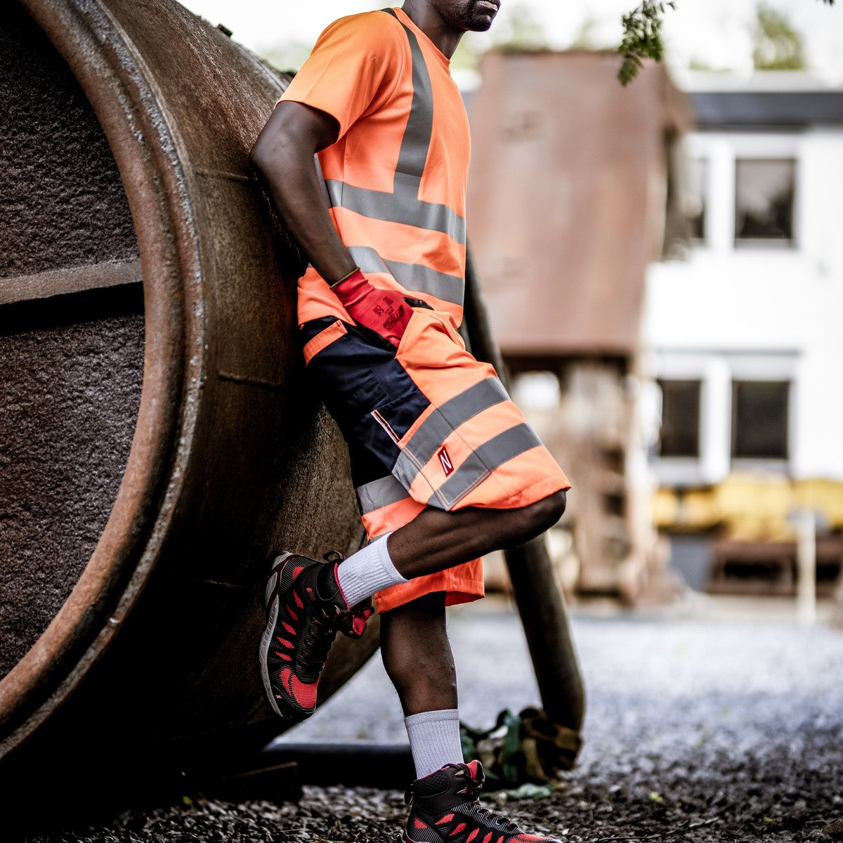 The short high-visibility work trousers NITRAS MOTION TEX VIZ impress with their high functionality, modern look and optimal safety. Thanks to eye-catching colors such as neon yellow/navy or neon orange/navy as well as reflective elements, you will be seen in all lighting conditions. The robust workmanship and the selection of many sizes (42-68) make these work trousers the ideal companion for daily use indoors and outdoors. The breathable material and the comfortable cut offer unrestricted freedom of movement and pleasant wearing comfort - even on hot days.